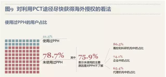 国内用户对利用PCT途径尽快获得海外授权依然有较高需求。部分用户表示迫切希望我国和印度、巴西建立PPH合作。此外,只有21.3%的受访用户使用过PPH。在78.7%未使用过PPH的用户中,75.9%(74.1%的企业、86.5%的高校和科研机构、65.4%的代理机构)的用户表示未使用的主要原因是对PPH不了解。